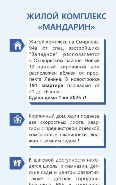 Арт. 90910867 Продаётся квартира-студия по адресу г. Барнаул ул. Смирнова 94а, ЖК Мандарин