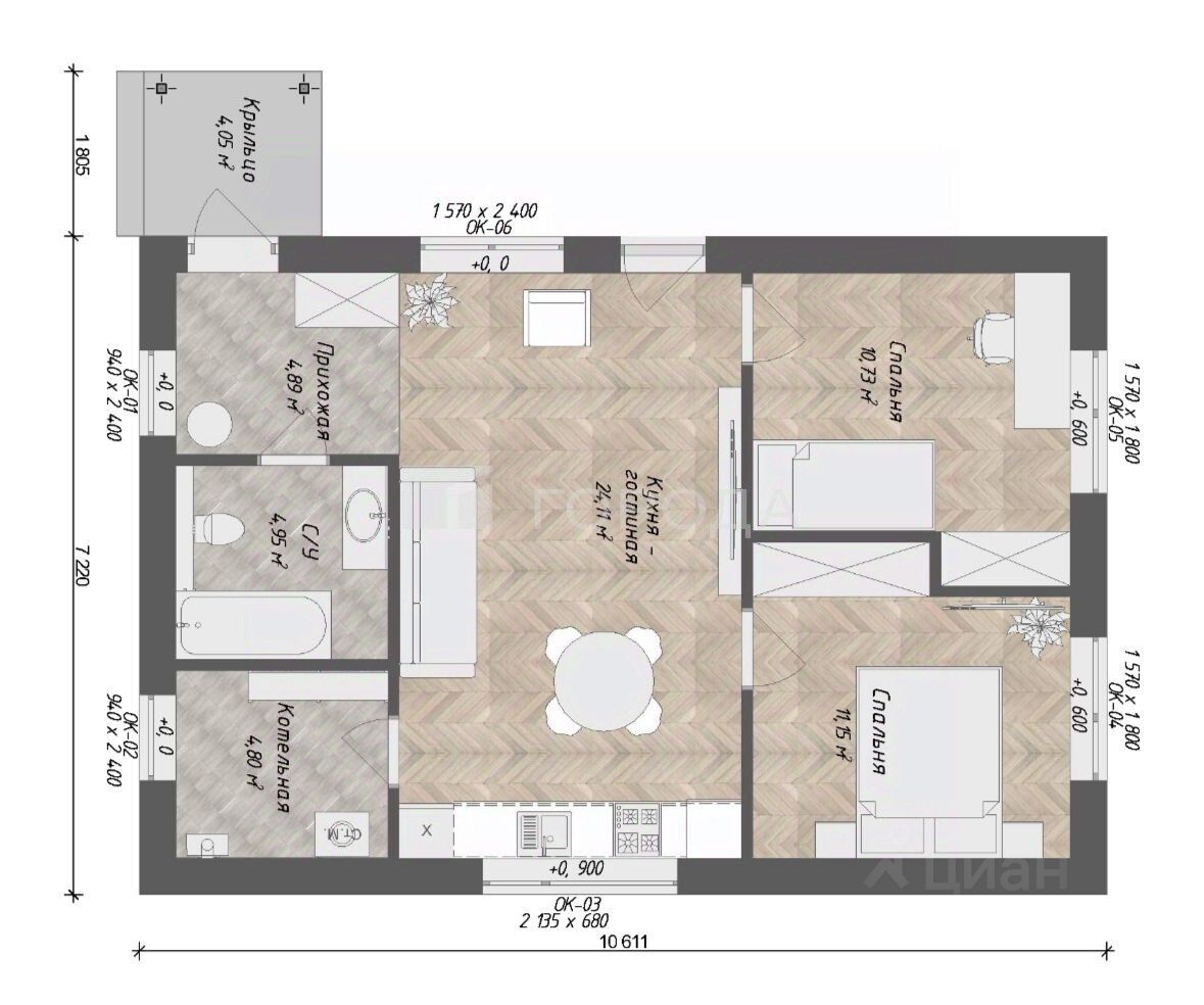 2 спальни с встроенными нишами под шкафы. Просторный санузел (5 м2): места хватит для размещения всех бьюти-средств, техники и инсталяции. Котельная, в которой можно разместить прачечную. Прихожая 5 м2,где точно хватит места для всей верхней одежды.