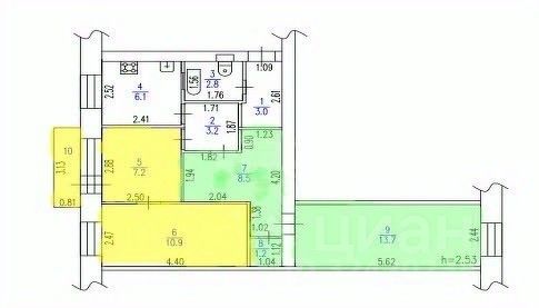 Продам две полноценные комнаты с балконом, общей площадью 21 кв.м., по документам 1/2 трёхкомнатной квартиры. Есть Соглашение о праве пользования помещением, то есть есть согласие второго собственника на раздел. Доли разделены. Общая площадь 56,6 м. кв. На планировке желтым цветом обозначена доля, которая продается. Собственник 1 взрослый. К местам общего пользования относится: кухня, коридоры, санузел с ванной.