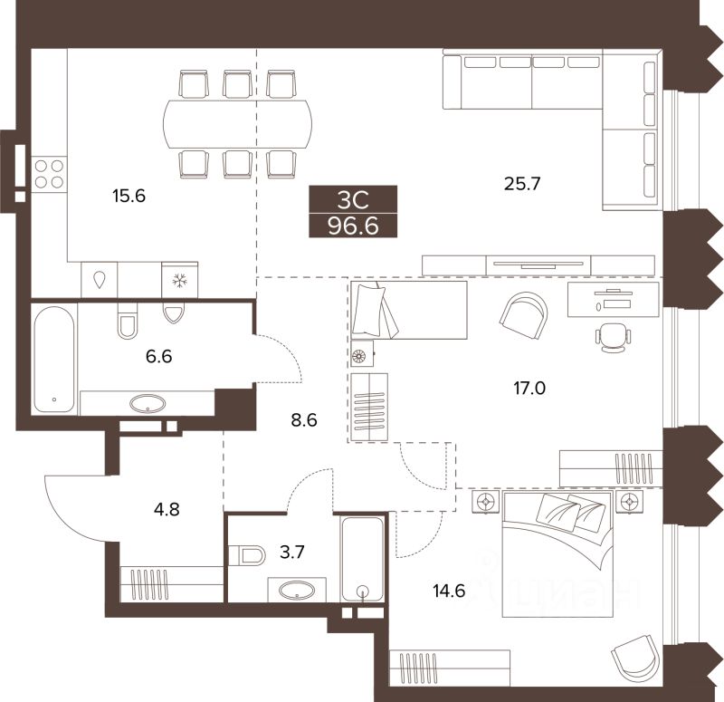 Продаётся 3-комнатная квартира в строящемся доме (Башня 2 и секция 2), срок сдачи: III-кв. 2029, общей площадью 96.6 кв.м., на 2 этаже. Новый жилой комплекс ''Сахаров Парк'' от Специализированного застройщика ''ДомСтрой-Барнаул22'' расположен по адресу: г. Барнаул, Социалистический пр-кт.