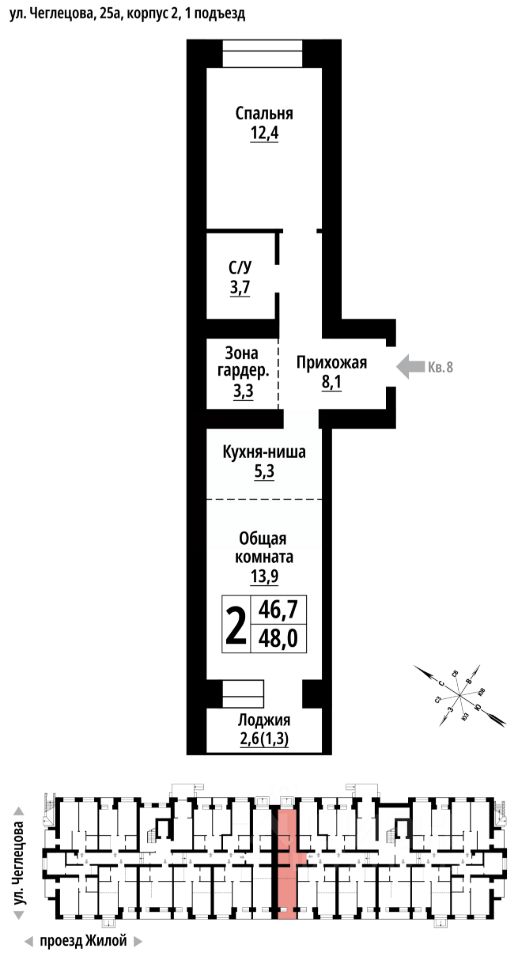 Продаётся 2-комнатная квартира в строящемся доме (Корпус 2), срок сдачи: II-кв. 2027, общей площадью 48 кв.м., на 1 этаже. ЖК ''Тургенев'' на ул. Чеглецова, 25а представляет из себя два кирпичных здания высотой 9 этажей. Предлагаем к покупке первый корпус, состоящий из двух подъездов. В каждом запроектированы квартиры с продуманной планировкой от 34,8-57,7 квадратных метров. Фасады выполнены в стилизованных формах с использованием остекленных лоджий и архитектурной подсветкой. Высота 1 и 9 этажа - 3 метра. На первом этаже предусмотрены нежилые помещения с гибким функциональным назначением.
