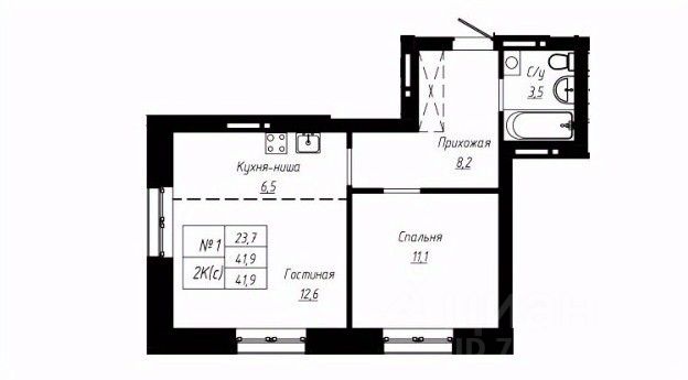 Общая площадь 42 м2 , Кухня-гостиная 19,4 12 , спальня 11,1 м2, большая гардеробная .