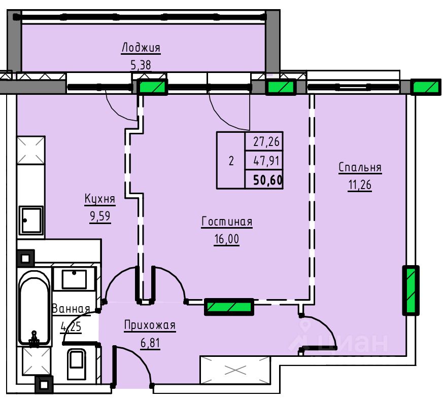 Общая площадь50,6 м2
